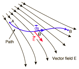 Applications of Line IntegralsThe line integral of electric field around a closed loop is equal to the voltage generated in that loop (Faraday's law): ![]() Such an integral is also used for the calculation of voltage difference since voltage is work per unit charge. Calculating the voltage difference near a point charge is a good example. The line integral of a force over a path is equal to the work done by that force on the path. ![]()