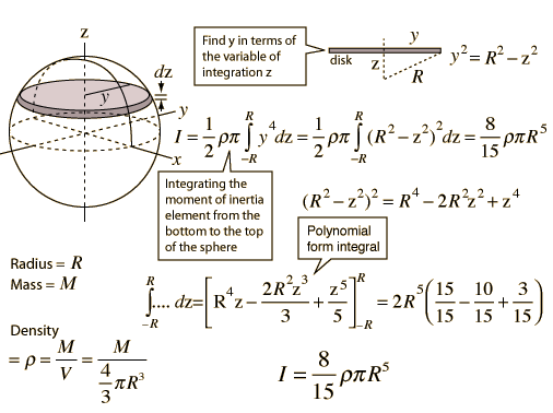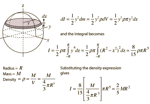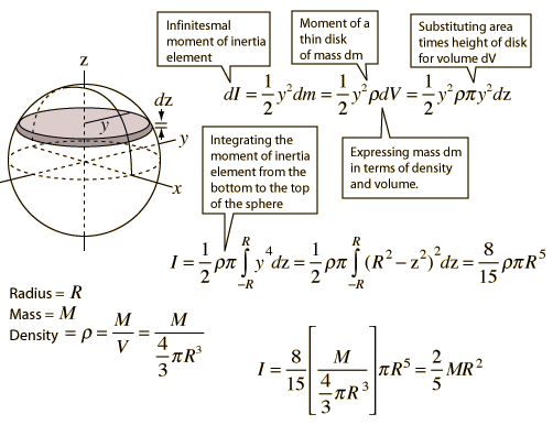 Sphere Integral DetailsDetails about the moment of inertia of a sphere.![]() The process involves integrating the moments of inertia of infinitesmally thin disks from the top to the bottom of the sphere. This involves polynomial form integrals. |