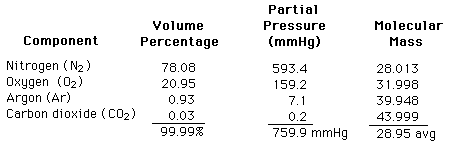 Constituents of the AirThe constituents of dry air can be expressed as volume percentages, which will translate to the partial pressures out of the total atmospheric pressure ![]() Since a mole of any ideal gas occupies the same volume, it follows that the volume percentage is also the percentage by number. The average molecular mass can then be found by weighting the masses by their volume percentages above.