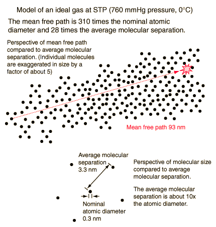 Mean Free Path PerspectiveYou may be surprised by the length of the mean free path compared to the average molecular separation in an ideal gas. An atomic size of 0.3 nm was assumed to calculate the other distances. ![]()