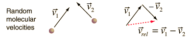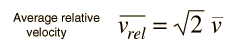 Average Relative VelocityIn order to calculate the mean free path for a molecule of a gas, it is necessary to assess the average relative velocity of the molecules involved rather than just the average velocity of any given molecule. The relative velocity of any two molecules can be expressed in terms of their vector velocities. ![]() The magnitude of the relative velocity can be expressed as the square root of the scalar product of the velocity with itself. ![]() This expression can be expanded as follows. ![]() Taking the average of the terms leads to ![]() Since the same average velocity would be associated with each molecule, this becomes ![]()