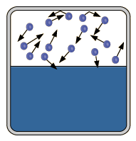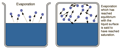 EvaporationOrdinary evaporation is a surface phenomenon - some molecules have enough kinetic energy to escape. If the container is closed, an equilibrium is reached where an equal number of molecules return to the surface. The pressure of this equilibrium is called the saturation vapor pressure. ![]()