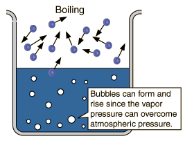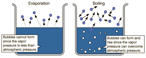 Evaporation vs BoilingOrdinary evaporation is a surface phenomenon - since the vapor pressure is low and since the pressure inside the liquid is equal to atmospheric pressure plus the liquid pressure, bubbles of water vapor cannot form. But at the boiling point, the saturated vapor pressure is equal to atmospheric pressure, bubbles form, and the vaporization becomes a volume phenomena. ![]() |