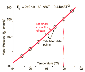 Boiling Point Variation Near 100 C![]() Values were taken from the saturated vapor pressure table for water near 100 degrees Celsius. An empirical fit to these data values was made, and the formula obtained is shown on the diagram. It could be considered to be reasonably valid only for a few degrees above and below 100 °C since the curve is very non-linear.