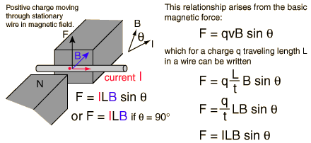 Magnetic Force on a Current-Carrying Wire![]() The magnetic force on a current-carrying wire is perpendicular to both the wire and the magnetic field with direction given by the right hand rule. ![]() If the current is perpendicular to the magnetic field then the force is given by the simple product: Force = Current x Length x B-fieldData may be entered in any of the fields. Whey you have finished entering data, click on the quantity you wish to calculate in the active formula above. The quantities will not be forced to be consistent until you click on a choice. Default values will be entered for unspecified parameters, but all values may be changed.