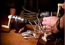 In the video below, the crank of one of the devices is turned to put in mechanical energy, resulting in electrical energy at the output. The handle of the other device is turned because electrical input is operating it as a motor. The last segment of the film lines up the handles of the devices and then turns the generator 1 turn. You can observe that the handle of the "motor" turns about 60% of a turn, indicating an efficiency of about 60% for the generator/motor exchange. But that is almost twice the efficiency of the electric generation system of the U.S., which yields electricity at about 33% efficiency! The reason is that this generator/motor pair does not have to go through the "thermal bottleneck" imposed by the second law of thermodynamics on the common electrical generation plants which operate as heat engines. The high efficiency of the transfer of energy from a generator to a motor finds widespread application in the operation of diesel-electric locomotives. It is difficult to mechanically transfer energy from the powerful diesel engines to the wheels of the locomotive which have low-friction metal-to-metal contact with the steel rails. So the power of the diesel engines is used to run a generator, and the generated electric power is used to operate electric traction motors to drive the wheels. The generated electric power can be very slowly and smoothly transferred to the wheels by the electric motors which drive the axles. You don't "pop the clutch" on a big locomotive with steel-on-steel wheels! You would just sit and spin the wheels until you melted the rails.