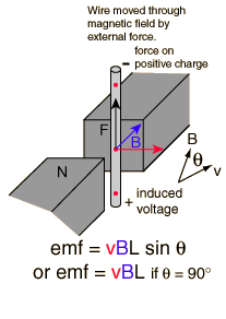 If the velocity is perpendicular to the magnetic field then the generated voltage is given by the simple product: Generated voltage = emf = Velocity x B-field x Length |
