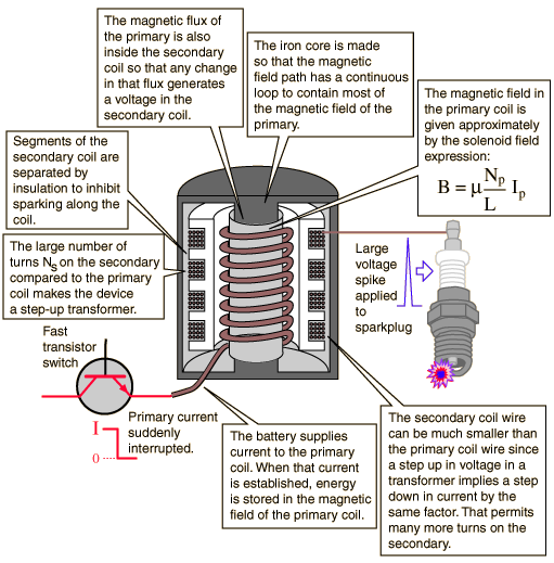The primary winding of the ignition coil is wound with a small number of turns and has a small resistance. Applying the battery to this coil causes a sizable DC current to flow (Ohm's law) even though it has a significant inductance which slows the increase of that current to its maximum value. The secondary coil has a much larger number of turns and therefore acts as a step-up transformer. But instead of operating on AC voltages, this coil is designed to produce a large voltage spike when the current in the primary coil is interrupted. Since the induced secondary voltage is proportional to the rate of change of the magnetic field through it, opening a switch quickly in the primary circuit to drop the current to zero will generate a large voltage in the secondary coil according to Faraday's Law. The large voltage causes a spark across the gap of the sparkplug to ignite the fuel mixture.