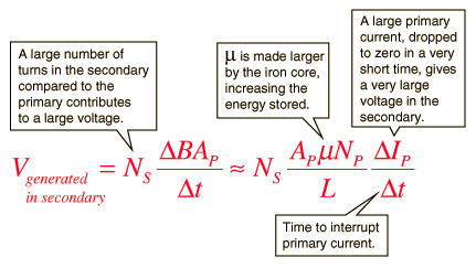 The current in the primary coil is caused to drop to zero quickly be the opening of a fast transistor switch. This causes the magnetic field in the primary coil to drop rapidly, generating a large voltage in the secondary coil. The generated voltage is proportional to the rate of change of the magnetic field according to Faraday's Law, and the amount of change is multiplied by the effect of the iron core in the coil.
