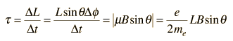 When a torque is exerted perpendicular to the angular momentum L, it produces a change in angular momentum DL which is perpendicular to L, causing it to precess about the z axis. Labeling the precession angle as f, we can describe the effect of the torque as follows: ![]() The precession angular velocity (Larmor frequency) is ![]() These relationships for a finite current loop extend to the magnetic dipoles of electron orbits and to the intrinsic magnetic moment associated with electron spin. There is also a characteristic Larmor frequency for nuclear spins. In the case of the electron spin precession, the angular frequency associated with the spin transition is usually written in the general form where g is called the gyromagetic ratio (sometimes the magnetogyric ratio). This angular frequency is associated with the "spin flip" or spin transition, involving an energy change of 2mB. An example for magnetic field 1 Tesla follows. ![]() The characteristic frequencies associated with electron spin are employed in electron spin resonance (ESR) experiments, and those associated with the nuclear spin in nuclear magnetic resonance (NMR) experiments. |