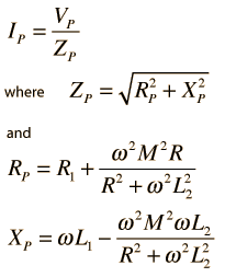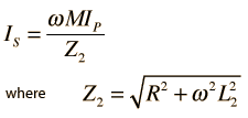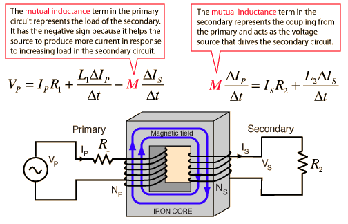 Circuit Equations:TransformerThe application of the voltage law to both primary and secondary circuits of a transformer gives: ![]() The transformer is the most common application of the concept of mutual inductance. In the transformer, the effect of the mutual inductance is to cause the primary ciruit to take more power from the electrical supply in response to an increased load on the secondary. For example, if the load resistance in the secondary is reduced, then the power required will increase, forcing the primary side of the transformer to draw more current to supply the additional need.