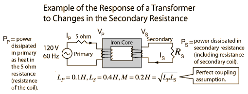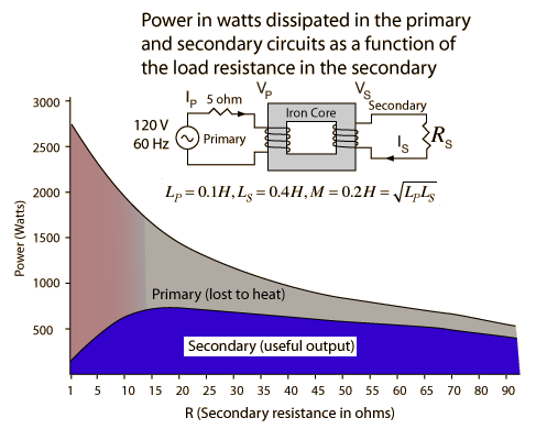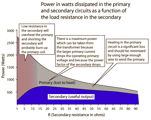 ![]() There is a practical midrange of load resistances for the operation of a transformer. In the example above, you can see that maximum output power is obtained with a load resistance between 15 and 20 ohms. When too heavy a load is drawn from the secondary, the primary coil heats up and the amount of audible "hum" that you hear from the transformer increases. My brother, Edgar Nave, worked in commercial electrical construction and wired many large transformers. He reports incidents when the secondary of a transformer was shorted, and says that the transformer would "squawl" like a wounded beast before it burned up the primary coil.