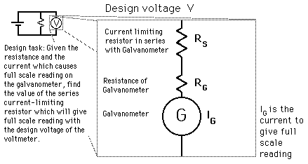 Voltmeter DesignVoltmeters, as well as ammeters and ohmmeters, are designed with the use of a sensitive current detector such as a galvanometer. ![]() A voltmeter is placed in parallel with a circuit element to measure the voltage drop across it and must be designed to draw very little current from the circuit so that it does not appreciably change the circuit it is measuring. To accomplish this, a large resistor is placed in series with the galvanometer. Its value is chosen so that the design voltage placed across the meter will cause the meter to deflect to its full-scale reading. A galvanometer full-scale current is very small: on the order of milliamperes.