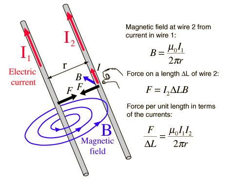 Magnetic Force Between Wires![]() The magnetic field of an infinitely long straight wire can be obtained by applying Ampere's law. The expression for the magnetic field is