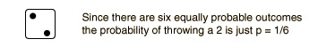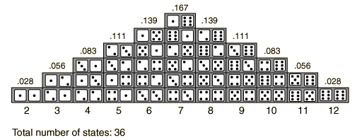 Statistics of Dice ThrowThe probababilities of different numbers obtained by the throw of two dice offer a good introduction to the ideas of probability. For the throw of a single die, all outcomes are equally probable. But in the throw of two dice, the different possibilities for the total of the two dice are not equally probable because there are more ways to get some numbers than others. There are six ways to get a total of 7, but only one way to get 2, so the "odds" of getting a 7 are six times those for getting "snake eyes". This simple example raises the idea of distinguishable states. For example, throwing a 3 is twice as likely as throwing a 2 because there are two distinguishable ways to get a 3. ![]() The probability of getting a given value for the total on the dice may be calculated by taking the total number of ways that value can be produced and dividing it by the total number of distinguishable outcomes. So the probability of a 7 on the dice is 1/6 because it can be produced in 6 ways out of a total of 36 possible outcomes.