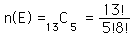 Basic ProbabilityThe probability for a given event can be thought of as the ratio of the number of ways that event can happen divided by the number of ways that any possible outcome could happen. The concept of probability is one of the foundations of general statistics. The likelihood of a particular outcome among the set of possible outcomes is expressed by a number from 0 to 1, with 0 representing an impossible outcome and 1 representing the absolute certainty of that outcome. If we identify the set of all possible outcomes as the "sample space" and denote it by S, and label the desired event as E, then the probability for event E can be written ![]() In the probability of a throw of a pair of dice, bet on the number 7 since it is the most probable. There are six ways to throw a 7, out of 36 possible outcomes for a throw. The probability is then ![]() The idea of an "event" is a very general one. Suppose you draw five cards from a standard deck of 52 playing cards, and you want to calculate the probability that all five cards are hearts. This desired event brings in the idea of a combination. The number of ways you can pick five hearts, without regard to which hearts or which order, is given by the combination ![]() ![]() The same basic probability expression is used, but it takes the form ![]() So drawing a five-card hand of a single selected suit is a rare event with a probability of about one in 2000. If you want the probabability that any one of a number of disjoint events will occur, the probabilities of the single events can be added. For example, the probability of drawing five cards of any one suit is the sum of four equal probabilities, and four times as likely. In boolean language, if the events are related by a logical OR, then the probabilities add. The probability of 5 hearts OR 5 clubs OR 5 diamonds OR 5 spades is approximately .002 or 1 out of 500, four times the probability of drawing 5 hearts. If the events are related by a logical AND, the resultant probability is the product of the individual probabilities. If you want the probability of throwing a 7 with a pair of dice AND throwing another 7 on the second throw, then the probability would be the product ![]() A common misconception about probability is that being "lucky" once will lower the probability that you will be "lucky" again. Probability has no causative effect, so prior events have no influence on the probability for future events. For example: