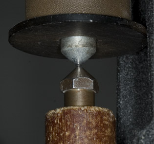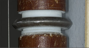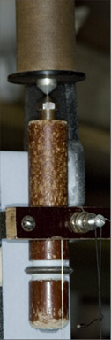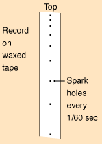 | On the insulating bob has been placed a metal ring with a sharp edge. It fills most of the space between the front wire and the back wire positioned behind the waxed tape. The sharp edge concentrates the electric field and makes it easier for a spark to jump to the ring and from the ring to the back wire, passing through the tape to make the mark. |