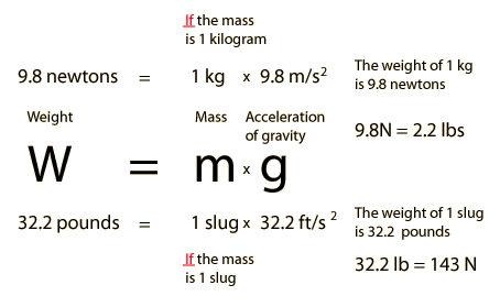 | A newton can be seen to be the force required to accelerate 1 kg of mass at 1 m/s2. To accelerate a 1 kg mass at 9.8 m/s2 would require 9.8 newtons, so on Earth the weight of 1 kg is 9.8 newtons. Similarly, a pound can be seen to be the force required to accelerate 1 slug of mass at 1 ft/s2. Since the acceleration of gravity in US common units is 32.2 ft/s2, it follows that the weight of one slug is 32.2 pounds. |
