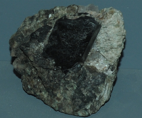This sample of allanite is displayed in the Smithsonian Museum of Natural History. Allanite is a silicate mineral but contains the rare elements cerium and lanthanum with the composition Ca(Ce,La)(Al, Fe)3(SiO4)3(OH). This sample is about 12x12 cm and is from Franklin, New Jersey. It also contains the mineral Microcline.