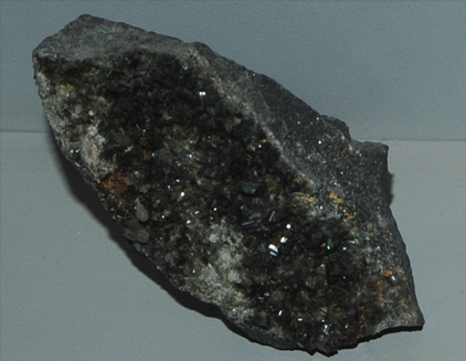 This sample of arrojadite is displayed in the Smithsonian Museum of Natural History. Arrojadite is a phosphate of composition KNa4Ca(Mn,Fe)14Al(PO4)12(OH)2. The sample at left is about 6 cm across and is from Rapid Creek, Yukon Territory, Canada.