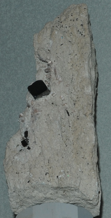 This sample of bixbyite is displayed in the Smithsonian Museum of Natural History. Bixbyite is an oxide mineral of manganese with the composition Mn2O3 . This sample is about 5x10 cm with small crystals of bixbyite, the largest being about a centimeter across. There are also small topaz crystals embedded in the rock matrix. The sample is and is from Thomas Range, Utah.