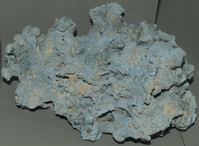 This sample of bromargyrite is displayed in the Smithsonian Museum of Natural History. Bromargyrite is a compound of silver with bromine, AgBr. The sample at left is about 14 cm across and is from Broken Hill, New South Wales, Australia.