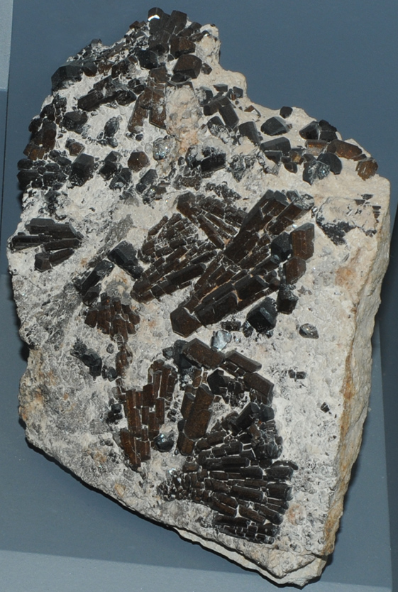 | Buergerite is a silicate which contains boron with composition NaFe3Al6(BO3)3Si6O18(O,F)4. This sample is about 18x16 cm and is from Mexiquitic, San Luis Potosi, Mexico. It is on display at the Smithsonian Museum of Natural History.