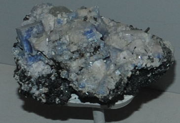 This sample of carletonite is displayed in the Smithsonian Museum of Natural History. Carletonite is a mineral that contains fluorine with the composition KNa4Ca4Si8O18(CO3)4(OH,F).H2O. The sample at left is about 6 cm across and is from Mon Saint-Hilaire, Quebec, Canada.