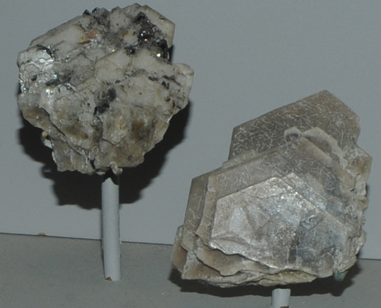 These samples of catapleiite are displayed in the Smithsonian Museum of Natural History. Catapleiite is a silicate mineral that contains zirconium with the composition Na2ZrSi3O9.2H2O. The samples are on the order of 5 cm across and are from Mont Saint-Hilaire, Quebec, Canada.