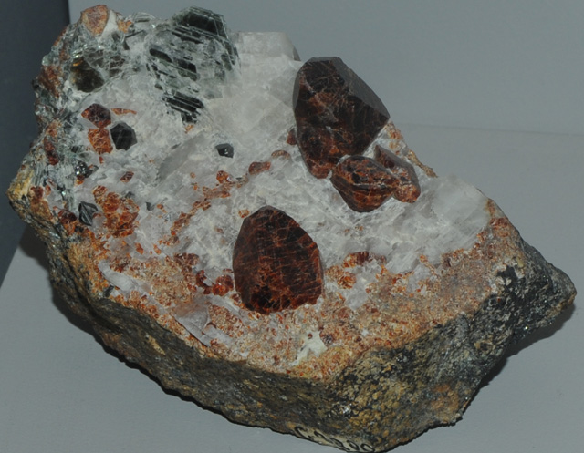 This sample of chlorite is displayed in the Smithsonian Museum of Natural History. Chlorite is more a group name than a specific mineral. It refers to layered mica-like minerals. See the Mindat reference for more details. This sample is about 20x12 cm and is and is characterized as chondrodite with chlorite. It is from the Tilly Foster mine, Brewster, New York.