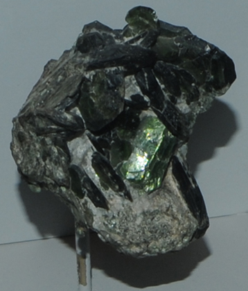 These samples of clintonite are displayed in the Smithsonian Museum of Natural History. Clintonite contains five of the big 8 elements plus fluorine with the composition Ca(Mg,Al)3(Al,Si)4O10(OH,F)2. The sample at left is about 7 cm across and is from Nicolai-Maximilianovsk mine, Achmatowsk, Zlatoust, Urals, Russia.