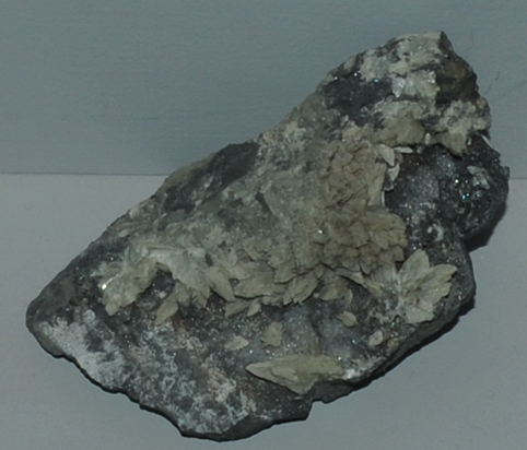This sample of collinsite is displayed in the Smithsonian Museum of Natural History. Collinsite is a phosphate mineral with the composition Ca2(Mg,Fe)(PO4)2.2H2O. The sample at left is about 9 cm across and is from Rapid Creek, Yukon Territory, Canada. The sample is described as collinsite with gorceixite.