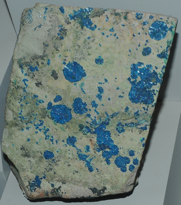 This sample of cornetite is displayed in the Smithsonian Museum of Natural History. Cornetite is a phosphate mineral of copper with the composition Cu3PO4(OH)4. The sample at left is about 12 cm across and is from Star of the Congo mine, Lubumbashi, Shaba, D. R. Congo.