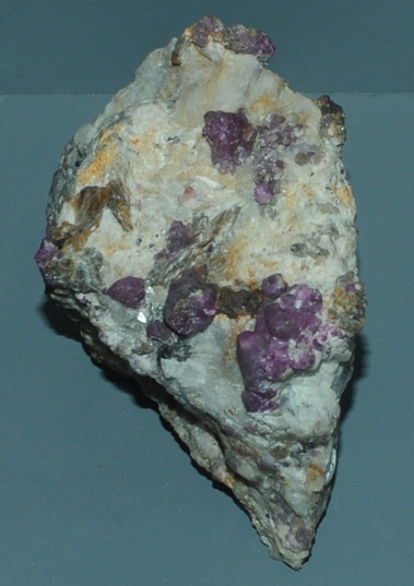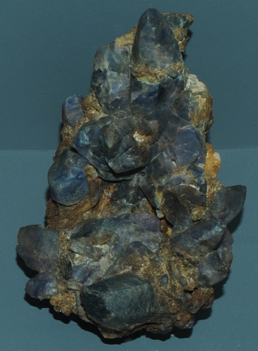 These samples of corundum are displayed in the Smithsonian Museum of Natural History. Corundum is a oxide mineral of aluminum with the composition Al2O3. The sample at left is about 6 cm across and is from Franklin, New Jersey.
