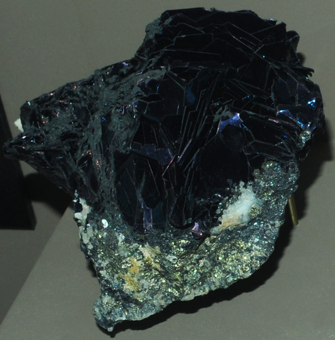 These samples of covellite are displayed in the Smithsonian Museum of Natural History. Covellite is a sulfide mineral of copper with the composition CuS. The sample at left is about 18 cm across and is from Leonard mine, Butte, Montana.