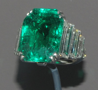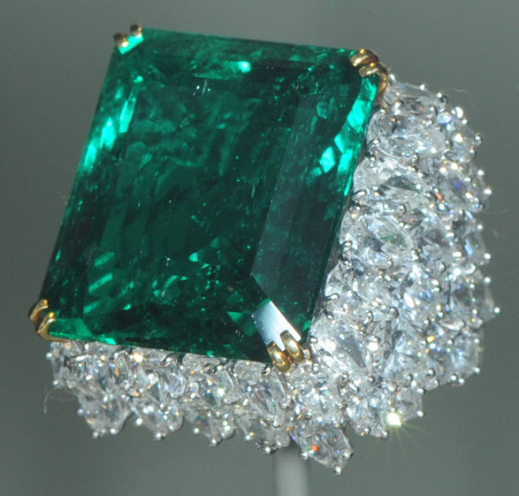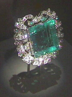 This is the Chalk Emerald, a 37.8 carat emerald from Columbia. Columbia is the major source of emeralds. It is nestled in a cluster of 60 pear-shaped diamonds weighing a total of 15 carats.