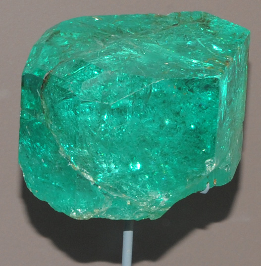 This is the Gachala Emerald from Vega de San Juan mine, Colombia. This uncut crystal weighs 858 carats - huge for an emerald. It is named after the mining district where it was found in 1967.