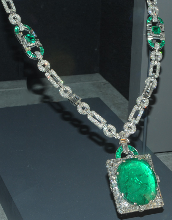 This huge emerald is set in an art deco diamond and platinum pendant. In 1931, Clarence Mackay gave the necklace as a wedding gift to his wife, Anna Case - a prima donna at the New York Metropolitan Opera from 1909 to 1920.