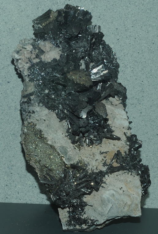 Enargite with pyrite from Quiruvilca mine, La Libertad, Peru. The sample is about 12x30 cm. The black metallic crystal sprays are enargite, an ore of copper. They grew on limestone, with brassy pyrite crystals.