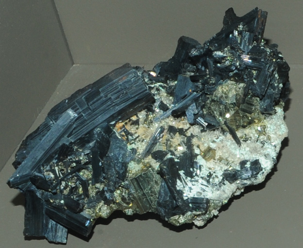 These samples of enargite are displayed in the Smithsonian Museum of Natural History. Enargite is an sulfide mineral of copper and arsenic with the composition Cu3AsS4. This sample is about 8X8 cm and is from Butte, Montana. The sample is described as enargite with pyrite.