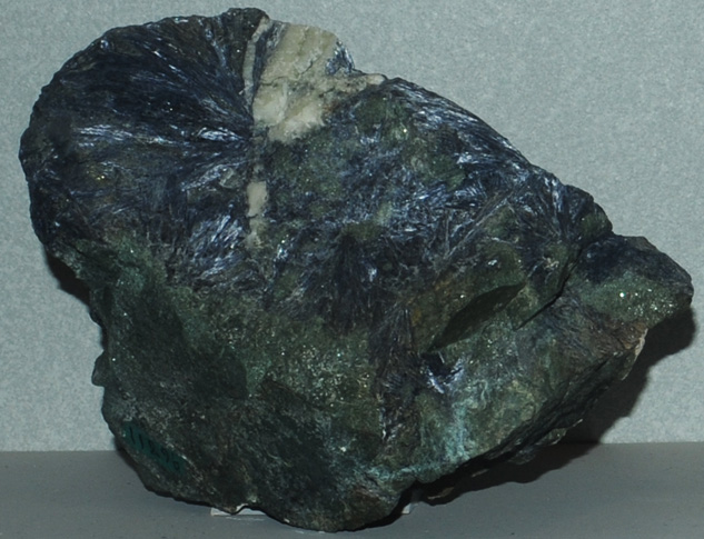 Glaucophane is a silicate with composition Na2(Mg,Fe)3Al2Si8O22(OH)2. It contains six of the "big-8" elements of the Earth's crust. The sample above is about 18x15 cm and is from Valley Ford, California. It is formed with with apatite and chlorite. The sample is on display in the Smithsonian Museum of Natural History.