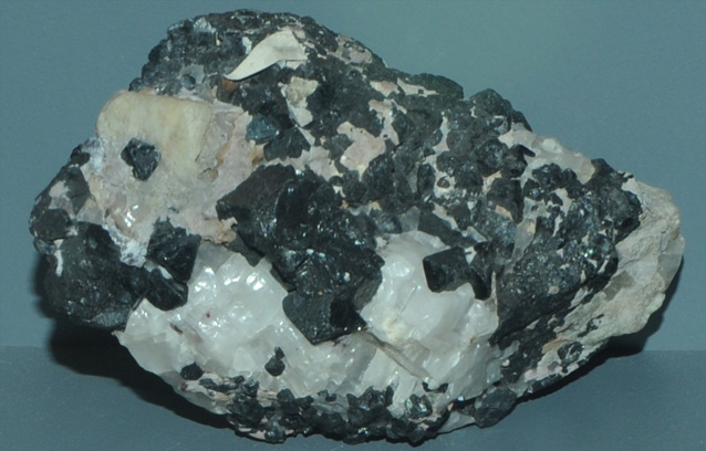 This sample of hardystonite is displayed in the Smithsonian Museum of Natural History. Hardystonite is a silicate mineral of zinc with the composition Ca2ZnSi2O7. The sample at left is about 15 cm across and is from Franklin, New Jersey. It is described as hardystonite with franklinite and calcite.