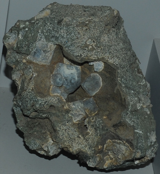 This sample of hauyne is displayed in the Smithsonian Museum of Natural History. Hauynehas the composition Na3Ca(Si3Al3)O12(SO4). The sample at left is about 15 cm across and is from Sacrofano Lazio, Italy.