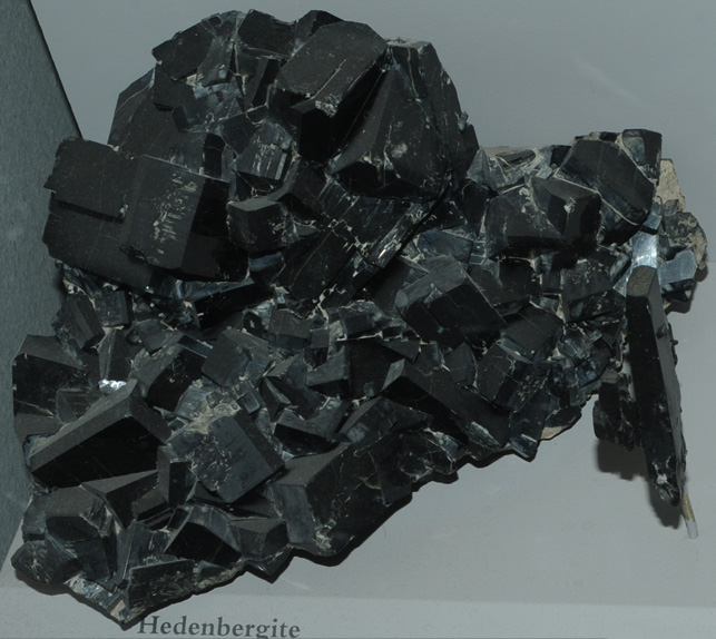 Hedenbergite is a silicate of calcium and iron with composition CaFeSi2O6. This sample is about 20x15 cm and is from Nordmark,Sweden. It is on display at the Smithsonian Museum of Natural History.