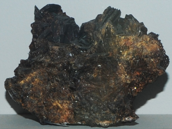 This sample of jarosite is displayed in the Smithsonian Museum of Natural History. Jarosite is a sulfate mineral of iron and potassium with the composition KFe3(SO4)2(OH)6. The sample at left is about 8 cm across and is from Santa Eulalia, Chihuahua, Mexico.