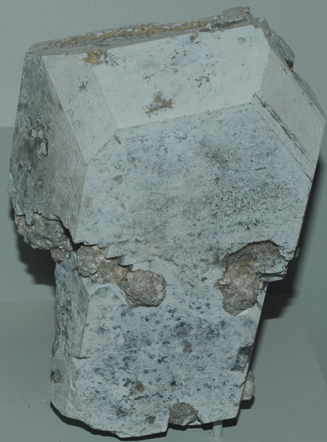 This sample of kurnakovite is displayed in the Smithsonian Museum of Natural History. Kurnakovite is a oxide mineral of boron (a borate) along with magnesium. It could be called magnesium borate. It has the composition MgB3O3(OH)5.5H2O. The sample at left is about 10 cm across and is from Boron open pit mine, Boron, California.