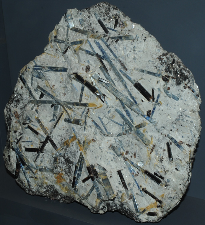 Kyanite is a silicate mineral of aluminum with composition Al2SiO5 . This sample is about 25x25 cm and is from Monte Campione, Uri, Switzerland. It is described as kyanite (the slender crystals) with staurolite (the background material). The chemical compostion is the same as the minerals sillimanite and andalusite. These samples are on display at the Smithsonian Museum of Natural History.