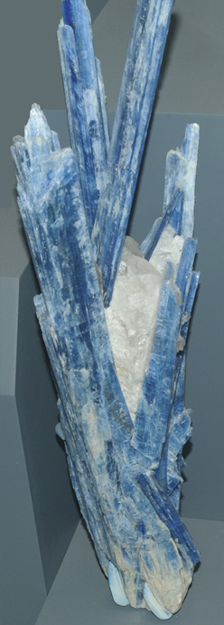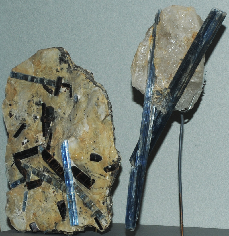 At left above is a kyanite sample from Monte Campione, Uri, Switzerland. It is about 15 x 25 cm. At right above are long slender blue crystals of kyanite on the order of 25 to 30 cm long. They are from Minas Gerais, Brazil.