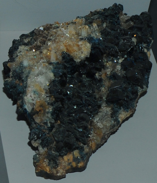 This sample of lazulite is displayed in the Smithsonian Museum of Natural History. Lazulite is a phosphate mineral of aluminum, magnesium and iron with the composition (Mg,Fe)Al2(PO4)4(OH). The sample at left is about 10 cm across and is from Rapid Creek, Yukon Territory, Canada. This sample is described as lazulite with quartz and siderite.
