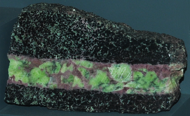 This sample of leucophoenicite is displayed in the Smithsonian Museum of Natural History. Leucophoenicite is a silicate mineral of manganese with the composition Mn7(SiO4)3(OH)2. The sample at left is about 12 cm long and is from Franklin, New Jersey. It is described as leucophoenicite with willemite and franklinite. The pink to reddish color is its typical appearance.